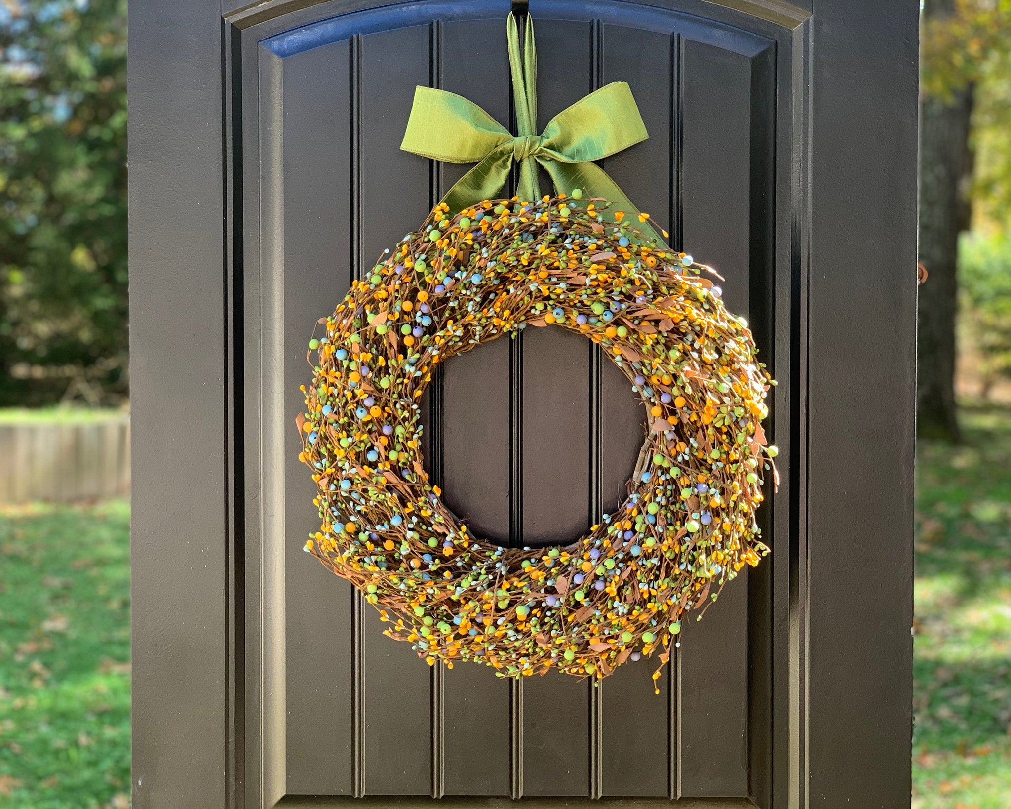 This beautiful multi-color wreath from Ever Blooming Originals is made from a sturdy grapevine base which is overflowing with an abundance of artificial berries in green, blue and yellow - all topped with a beautiful bow in the color of your choice (grass green is shown). It's the perfect way to brighten up your home for spring and summer.